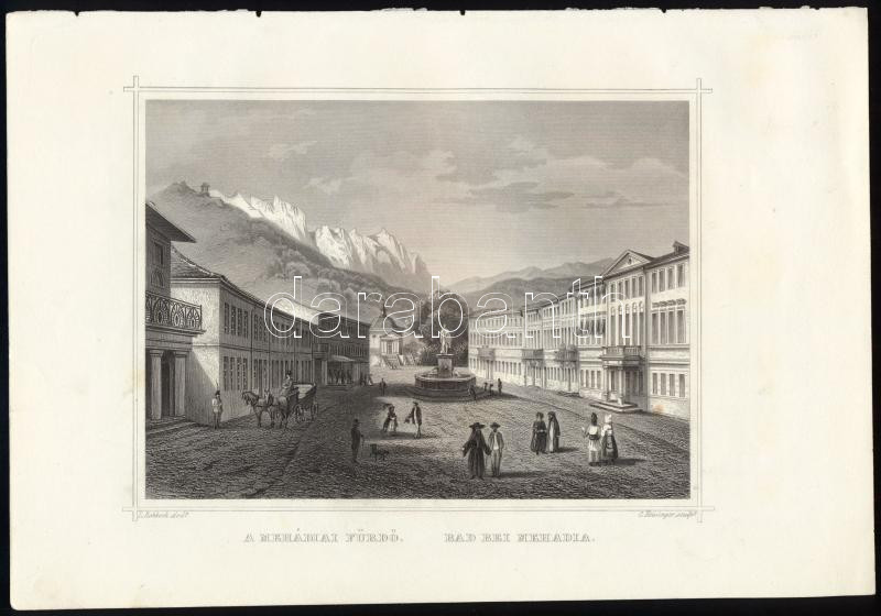 Ludwig Rohbock (1820-1883) - G. Heisinger: A mehádiai fürdő (Bad be Mehadia), Erdély. Acélmetszet, papír, jelzett a metszeten, 12,5x17 cm