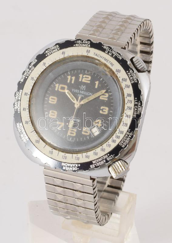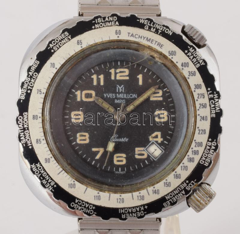 Yves Meillon Paris kvarc karóra, működik, fém szíjjal, sérült üveggel, d: 40mm