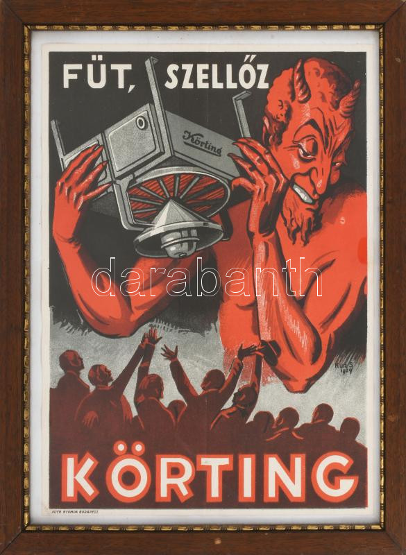 1929 "Fűt, szellőz, Körting." Körting B. és E. Rt. kalorifer kereskedő reklámja, jelzett a dúcon (Kun S. 1929), Bp., Auer-ny., hajtott, modern üvegezett fa keretben, 30x22 cm, keret: 35x27 cm