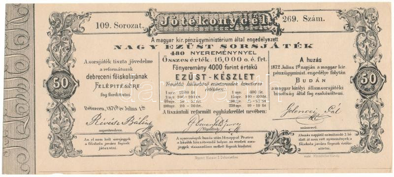 1871. Debrecen "Jótékony cél - Nagy Ezüst Sorsjáték" sorsjegye 50kr értékben a Debreceni Református Főiskola felépítésére, "109. 269." sorozat és sorszámmal T:AU nyomdai papírránc