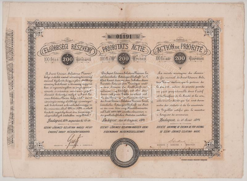 1894. Budapest "Szent-Lőrincz-Szlatina-Nasici Helyi Érdekű Vasút Részvénytársaság" elsőbbségi részvénye 200K-ról "01191", szárazpecséttel T:F foltos, kis anyaghiány