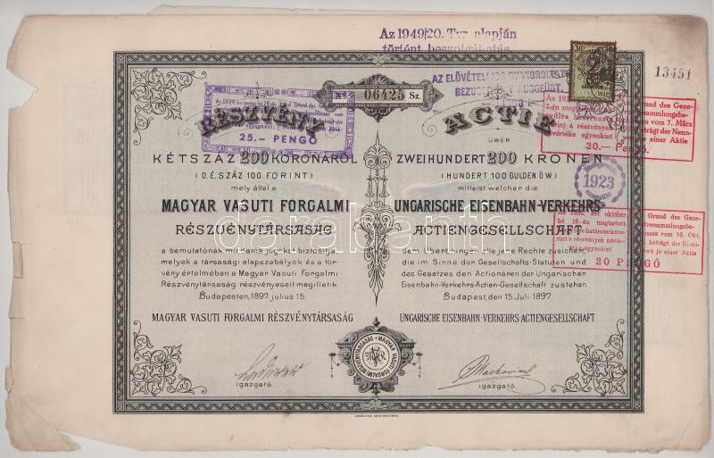 1897. Budapest "Magyar Vasuti Forgalmi Részvénytársaság" részvénye 200K-ról, szelvényekkel, bélyegzésekkel, osztrák okmánybélyeggel, "06425" T:VG
