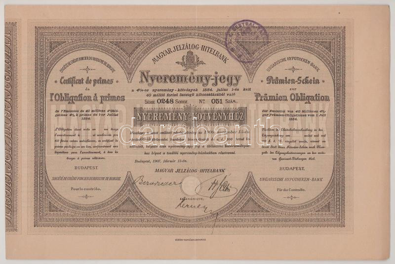 1907. Budapest "Magyar Jelzálog Hitelbank" nyeremény jegye "0248 051" T:XF