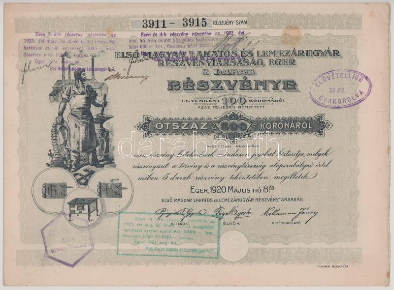 1920. Eger "Első Magyar Lakatos és Lemezárugyár Részvénytársaság, Eger" 5db részvénye egyben, egyenként 100K-ról, összesen 500K-ról "3911-3915", szárazpecséttel, bélyegzésekkel, szelvényekkel T:XF fo.