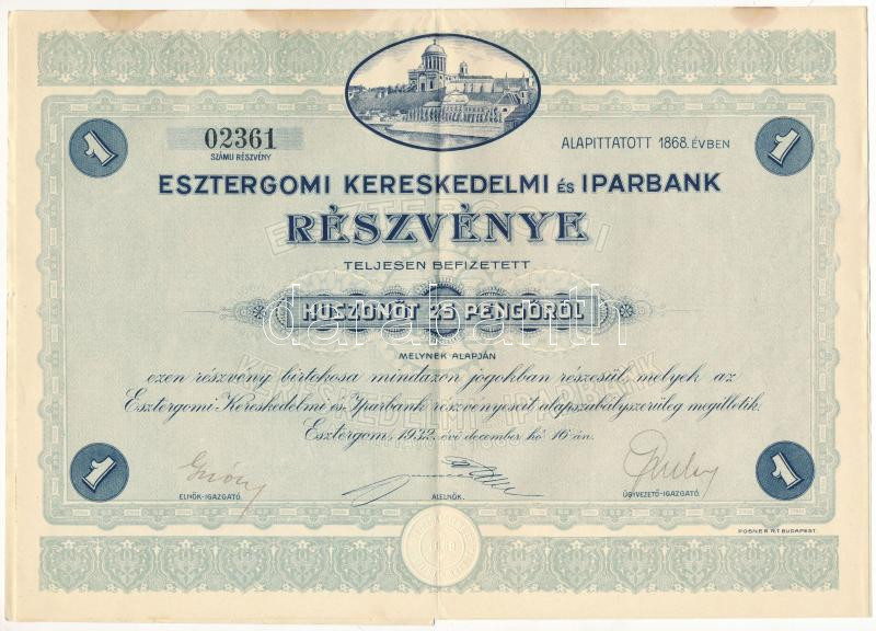 1932. Esztergom "Esztergomi Kereskedelmi és Iparbank" részvénye 25P-ről, szárazpecséttel és szelvényekkel T:F