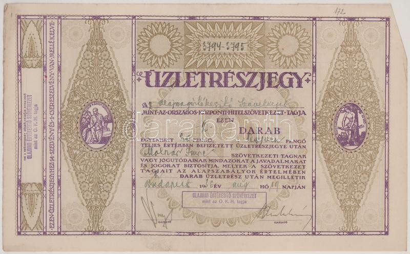 1936. "Olajmagértékesítő Szövetkezet" 2db üzletrészjegy egyben, összesen 40P értékben, szelvényekkel, bélyegzéssel T:F