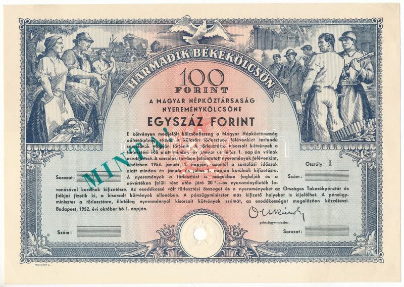 1952. Budapest "Harmadik Békekölcsön - a Magyar Népköztársaság nyereménykölcsöne - első osztály" 100Ft-ról, szárazpecséttel, sorszám nélkül, "MINTA" felülbélyegzéssel, lyukasztással érvénytelenítve, hátoldalon "OTP Bank Pénzügytört. Szgyüjt. Lelt. sz.:" bélyegzéssel T:AU,XF sarokhajlások, jobb felső sarokban pici beszakadás