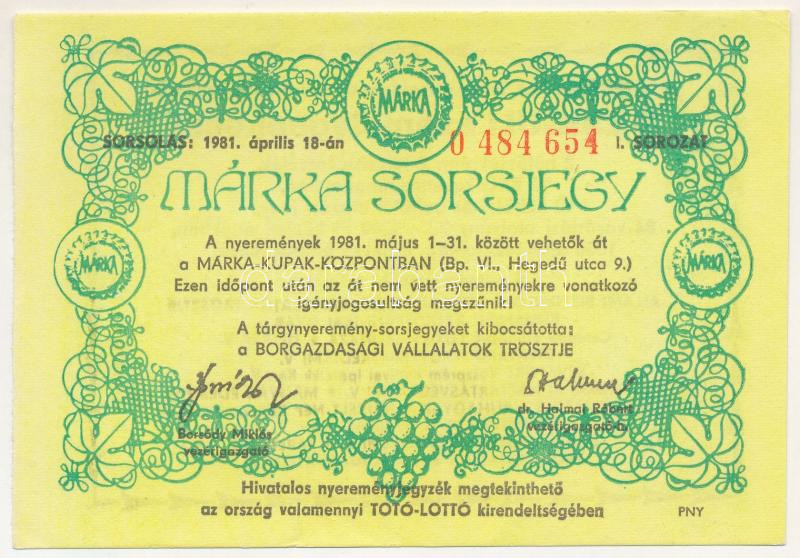 1981. "Márka Sorsjegy" a Borgazdasági Vállalatok Trösztjének sorsjátéka, III. sorozat, "0 484 654" sorszámú sorsjegye T:AU