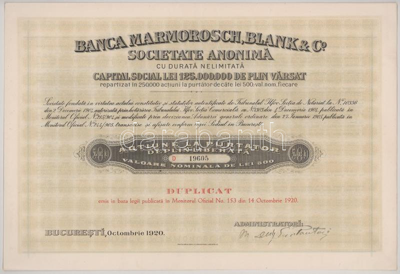 Romania / Bucharest 1920. "Banca Marmorosch, Blank&Co. Societate Anonima" share about 500 Lei "D 19605" C:XF