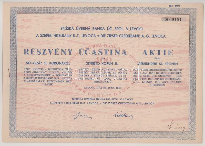 Slovakia / Levoca 1940. "Szepesi Hitelbank R.-T., Levoca" share about 400 Korun, in Hungarian, Slovak and German "00104", with embossed stamp and with coupons stapled C:AU,XF tiny tear