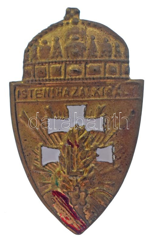 1930-1940 k. "Isten-Haza-Király" részben festett bronz, koronás Levente sapkajelvény (55x32mm) T:XF,VF festés lekopott