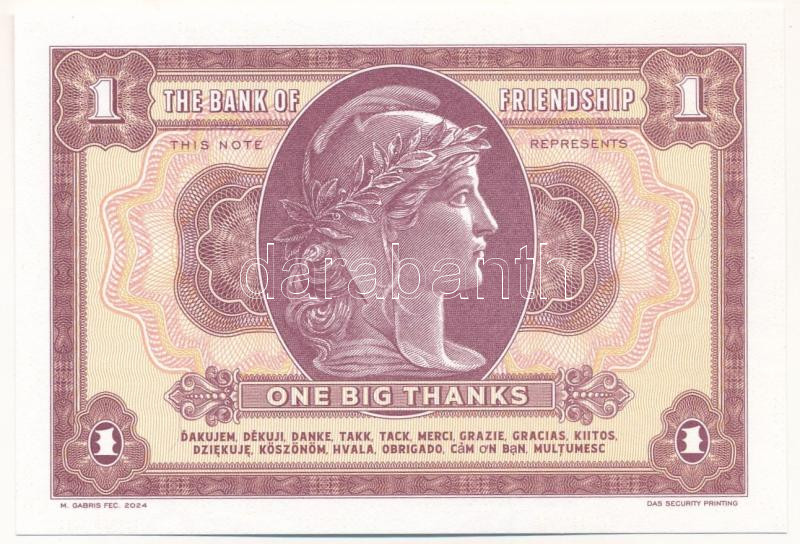 Csehország 2024. "1 Nagy Köszönöm - A Barátság Bankja" "Gabrisnote" egyoldalas fantáziabankjegy, rajta a köszönöm szó, több nyelven T:UNC