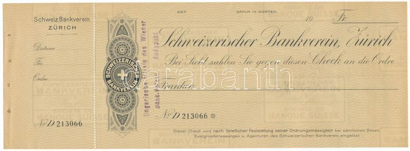 Switzerland "Schweiz Bankverein Zürich" blank check "D213066", "Ungarische Filiale des Wiener Bank-Verein Budapest" stamp and with "4 Fillér" stamp at the back C:AU pinholes