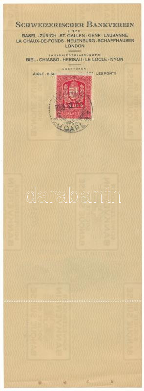 Svájc "Schweiz Bankverein Zürich" kitöltetlen csekk "D213066", "Ungarische Filiale des Wiener Bank-Verein Budapes" (Bécsi Bankszövetség Magyarországi Fiókja) bélyegzéssel, hátoldalon "4 fillér" bélyeggel T:AU tűlyukak