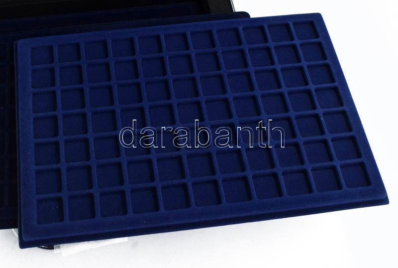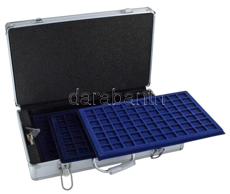 AlumÃnium érmetartó koffer használt, de újszerű állapotban, kulcsokkal. Benne 5db érmetartó tálca: 2db 45x45mm-es és 24 férÅ‘helyes, 1db 32x32mm-es 40 férÅ‘helyes, 2db 23x23mm-es 77 férÅ‘helyes fészkekkel. Összesen 242 férÅ‘hellyel.