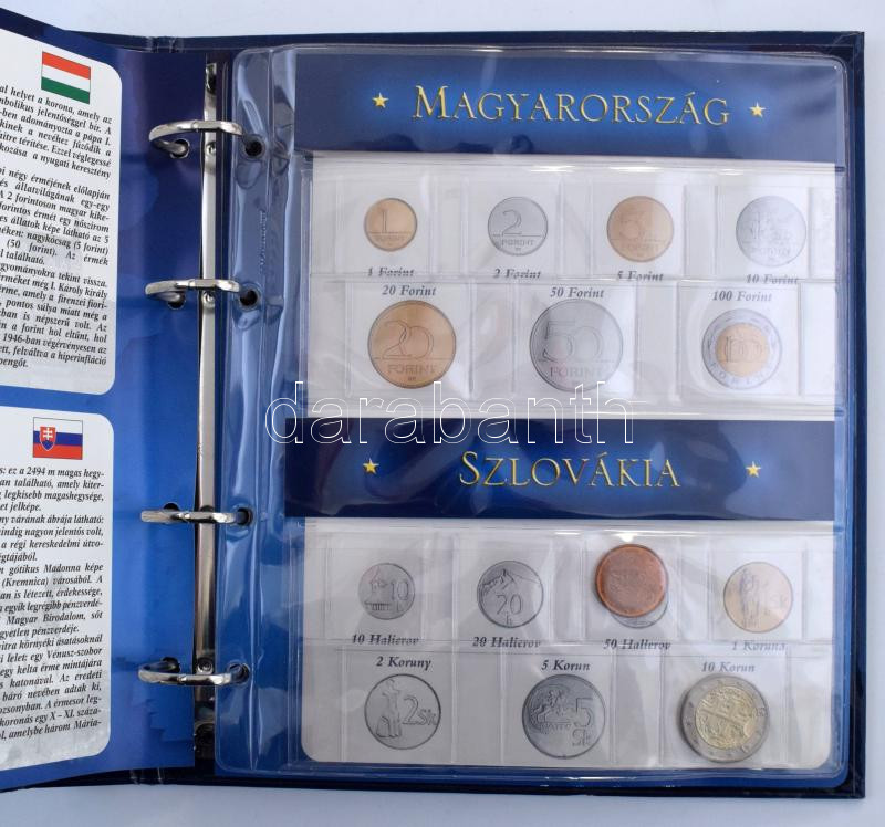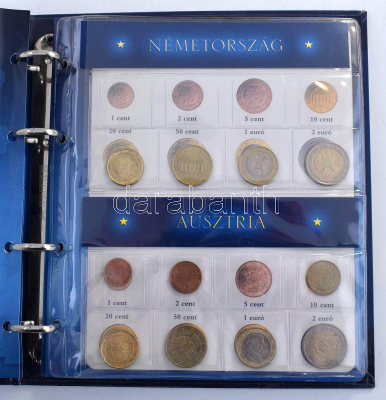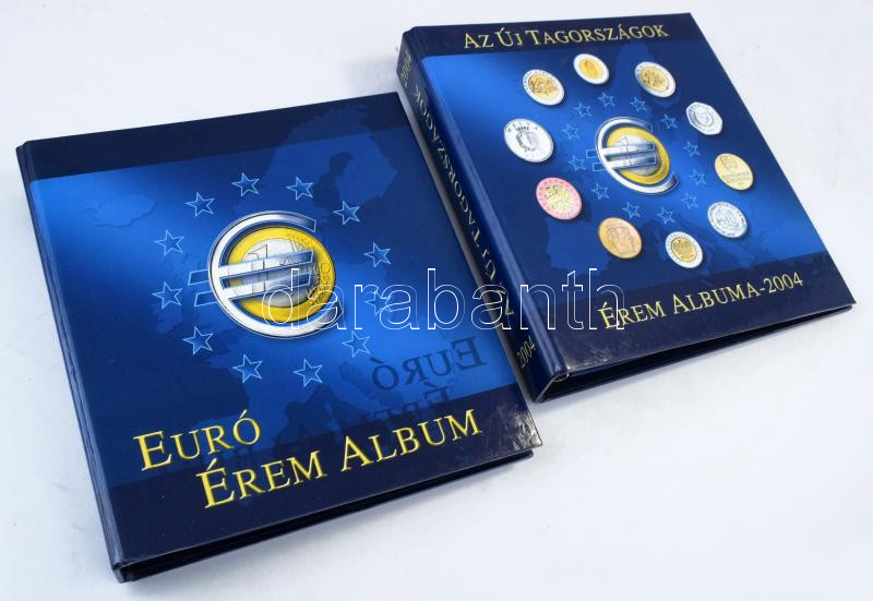 "Az Új Tagországok Érem Albuma 2004" négygyűrűs érmetartó album 5db berakólappal különböző méretű érmék számára, benne néhány szlovák, szlovén és litván érmével + "EURÓ ÉREM ALBUM" négygyűrűs érmeberakó, 6db berakólappal különböző méretű érmék számára, benne német, osztrák, francia, olasz, holland, belga, spanyol, portugál, görög, luxemburgi és ír érmékkel. Használt, de jó állapot.