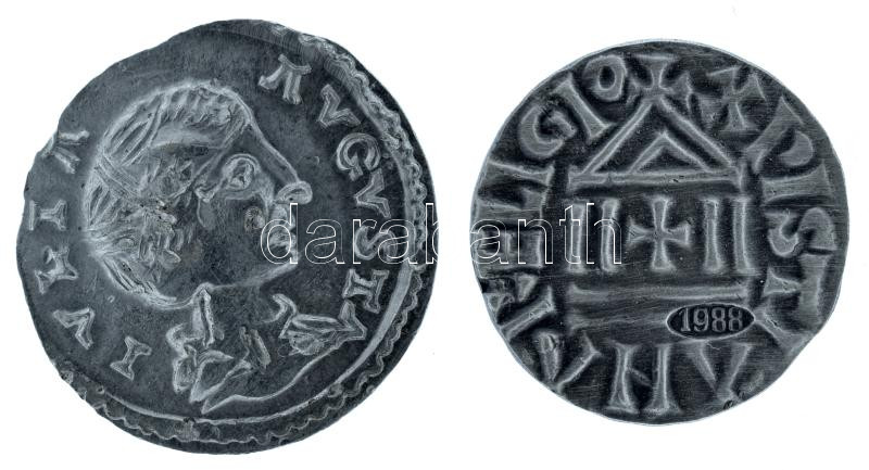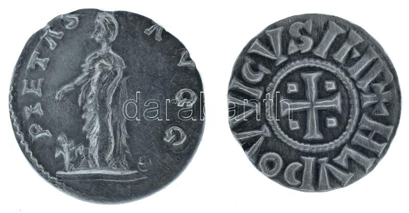 Római Birodalom 98-117 / Iulia Augusta "PIETAS AVGG" Denarius ezüstözött fém replika kapszulában + Karoling Birodalom 823-840. I. Lajos dénár ezüstözött fém replika kapszulában, "1988" évszámmal T:UNC