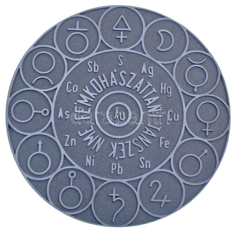 1984. "NME Fémkohászattani Tanszék" egyoldalas fém emlékérem fémek vegyjeleivel, illetve a hozzájuk tartozó alkímiai jelekkel, hátoldalán "A 40 éves találkozó emlékére - Sopron, 1984. IX. 5-7." gravírozással (98mm) T:AU