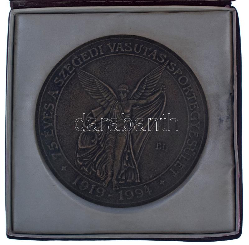 1994. "75 éves a Szegedi Vasutas Sportegyesület 1919-1994" egyoldalas bronz emlékplakett, enyhén sérült díszdobozban (120mm) T:AU