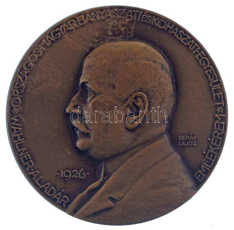 Berán Lajos (1882-1943) 1926. "Országos Magyar Bányászati és Kohászati Egyesület Wahlner Aladár Emlékérem / Egyesületi életünk terén kifejtett tevékenységéért" névre szólóan gravírozott bronz emlékérem (50mm) T:AU