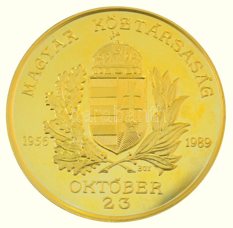 Bognár György (1944-) 1990. "Magyar Köztársaság 1956-1989. Október 23. / Hazádnak rendületlenül légy híve, oh magyar" aranyozott bronz emlékérem dísztokban (65mm) T:AU (eredetileg PP) folt