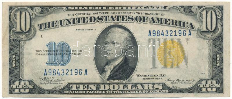 Amerikai Egyesült Államok 1935-1945 (1934A) 10$ "Silver Certificate" sárga pecsét, Észak-Afrikai katonai kiadás, "William Alexander Julian - Henry Morgenthau Jr." "A98432196A" T:F szép papír