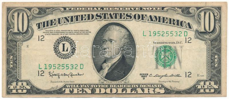 Amerikai Egyesült Államok 1957-1961 (1950D) 10$ "Federal Reserve Note" zöld pecsét "Kathryn O'Hay Granahan - Clarence Douglas Dillon" T:F