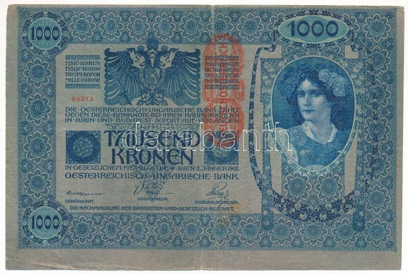Ausztria 1919 (1902) 1000K, függőleges "DEUTSCHÖSTERREICH" felülbélyegzéssel, mindkét oldal német, látványosan eltolódott nyomat T:F,VG
