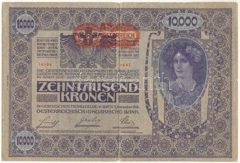 Ausztria 1919. (1918) 10.000K hátlap rajzos, vízszintes "DEUTSCHÖSTERREICH" felülbélyegzéssel, II. kiadás, "1647 16194" T:VG