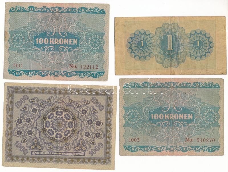 Austria 1922. 100 Kronen (2x) + 1000 Kronen + Austria / Allied occupation 1944. 1 Schilling C:F-VG