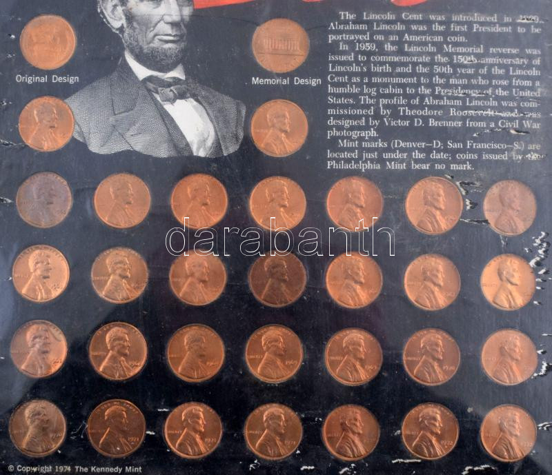 USA 1958 cca-1972. 1 Cent bronze "Lincoln" (32xdiff) in "Lincoln Memorial Coins" wooden frame C:UNC-XF patina