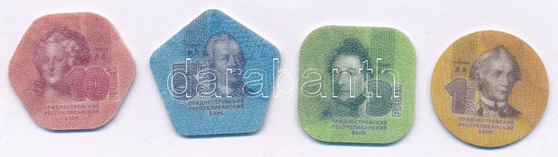 Dnyeszter-menti Köztársaság 2014. 1R + 3R + 5R + 10R. A Dnyeszter-menti Köztársaság Moldova keleti részén, a Dnyeszter folyó mentén helyezkedik el; egy, az ott élő orosz lakosság által kikiáltott, nemzetközileg el nem ismert szakadár államalakulat. A kezdeti időszakban a forgalomban lévő szovjet, majd orosz bankjegyeket felülbélyegezték, később azonban áttértek saját bankjegyek kibocsátására az aprópénzt, a kopejkát pedig szerződéses alapon verették Lengyelországban. Ez diplomáciai feszültséget okozott Moldova és Lengyelország között, majd 2004-ben az ukrán hatóságok lefoglaltak egy nagy értékű érmeszállítmányt. Az egyre fokozódó politikai nyomás hatására a lengyel pénzverde végül felmondta az együttműködést. Ennek következményeként 2005-ben pénzverde nyílt Tiraszpolban, amely azóta is a helyi pénzkibocsátás központjaként működik. 2014-ben a legkisebb címletű bankjegyek helyettesítésére bevezették a világ első, hivatalos fizetőeszközként használt műanyag érmesorozatát. Az érmék korszerű polikarbonátból készültek, rendkívül tartósak és szinte törhetetlenek. Az egyes címletek eltérő formája és színe nemcsak a könnyebb azonosítást segíti, hanem a hamisítás elleni védelmet is. T:UNC