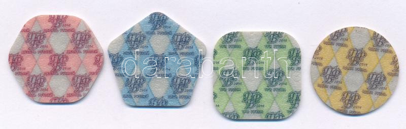 Transnistria 2014. 1 Rouble + 3 Roubles + 5 Roubles + 10 Roubles. The Transnistrian Republic is located in eastern Moldova, along the Dniester River; it is an internationally unrecognized breakaway state proclaimed by the Russian population living there. In the early period, the Soviet and then Russian banknotes in circulation were overstamped, but later they switched to issuing their own banknotes, the small notes, and the kopeck was minted in Poland on a contractual basis. This caused diplomatic tension between Moldova and Poland, and in 2004, the Ukrainian authorities seized a large shipment of coins. As a result of the increasing political pressure, the Polish mint finally terminated the cooperation. As a result, a mint was opened in Tiraspol in 2005, which has been the center of local money issuance ever since. In 2014, the world's first series of plastic coins used as official currency was introduced to replace the smallest denomination banknotes. The coins are made of advanced polycarbonate, making them extremely durable and virtually unbreakable. The different shapes and colors of each denomination not only help with identification, but also protect against counterfeiting. C:UNC
