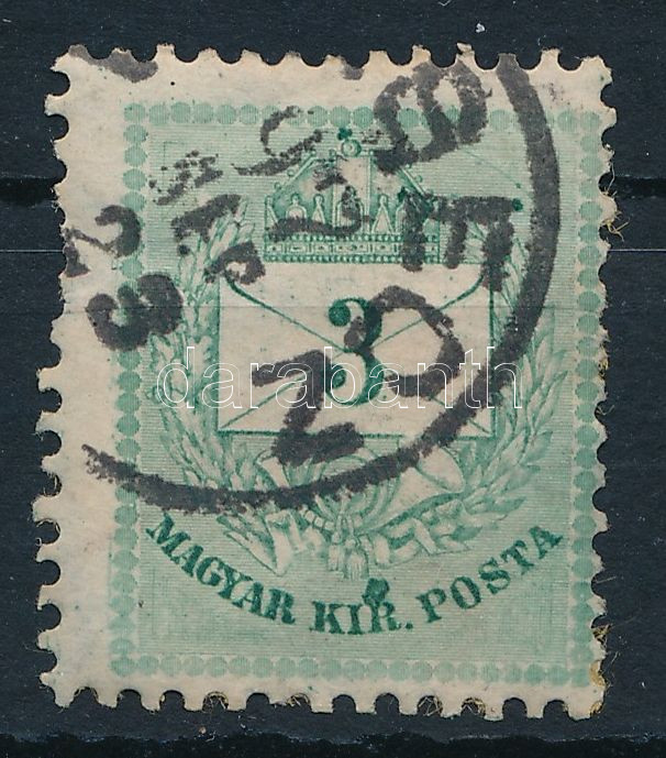 1881 3kr a "KIR." szó "R" betűje felett nagy folttal (foghibák / perf. faults)