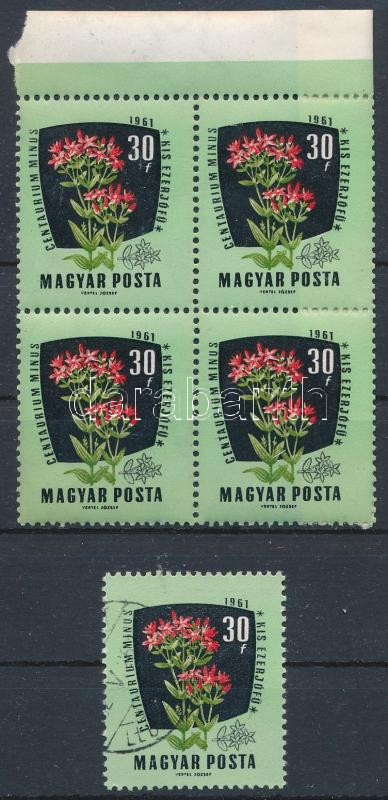 1961 Gyógy- és ipari növények 30f négyestömb a piros szín felfelé tolódásával + támpéldány