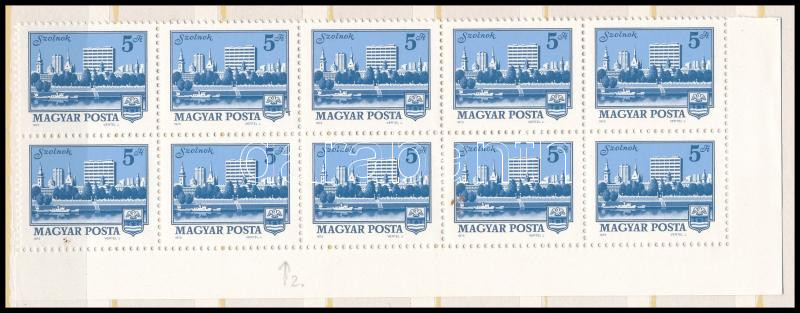 1975 Tájak - Városok Szolnok 5Ft ívsarki 10-es tömbben, benne "repülő madár" tévnyomat