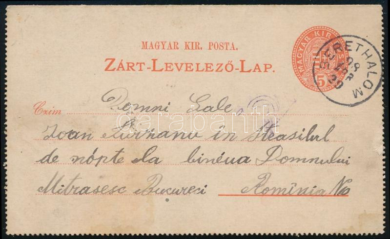1898 Díjjegyes zárt levelezőlap Romániába küldve, "BERETHALOM"