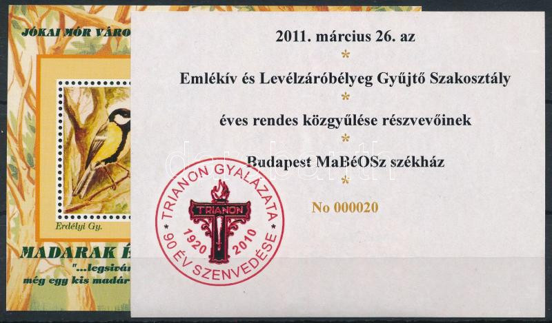 2011 Madarak és fák napja fogazott és vágott emlékív "Emlékív és Levélzáróbélyeg Gyűjtő Szakosztály éves közgyűlés résztvevőinek" hátoldali felirattal, azonos sorszámmal