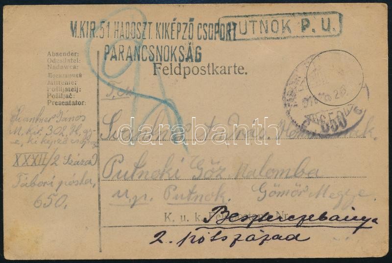~1915 Tábori posta levelezőlap / Field postcard "M.KIR.51. HADOSZT. KIKÉPZŐ CSOPORT PARANCSNOKSÁG" + "TP 650" + "PUTNOK P.U."