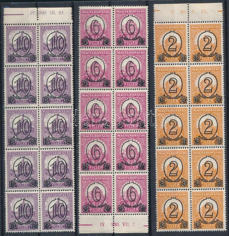1931 Kisegítő bélyegek 2/3f, 6/8f, 10/16f értékek IX. vízjellel 10-es tömbökben ívszéli felirattal (25.000+)