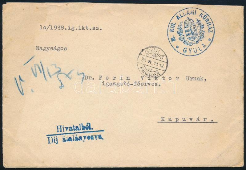 1938 Hivatalos levél "M.KIR ÁLLAMI KÓRHÁZ / GYULA" - "KAPUVÁR"