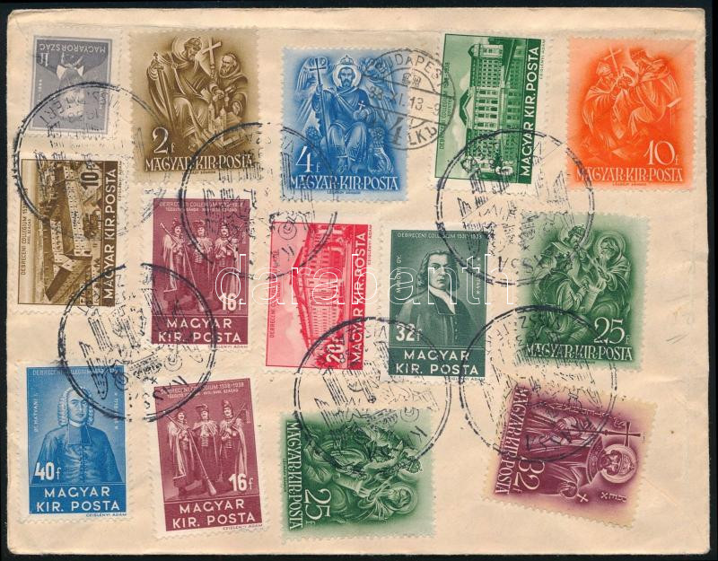 1938 Levél a hátoldalon 14 db bélyeggel és "KASSA VISSZATÉRT" bélyegzésekkel, Budapestre