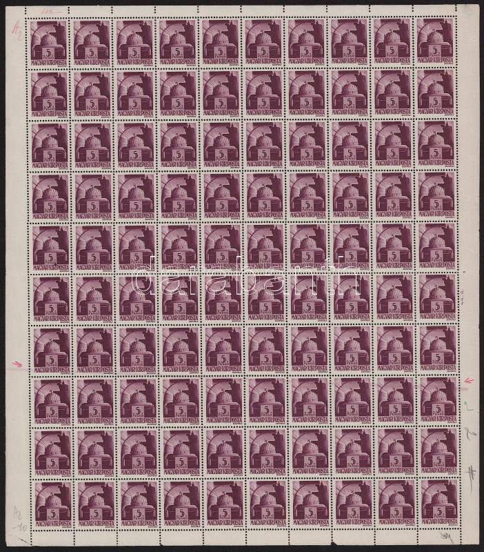 1944 Hadvezérek 5P hajtott teljes ív rákelcsík a 8. és 9. bélyegsoron ferdén, 5-5 bélyegen mindkét sorban