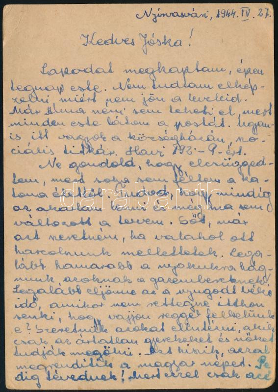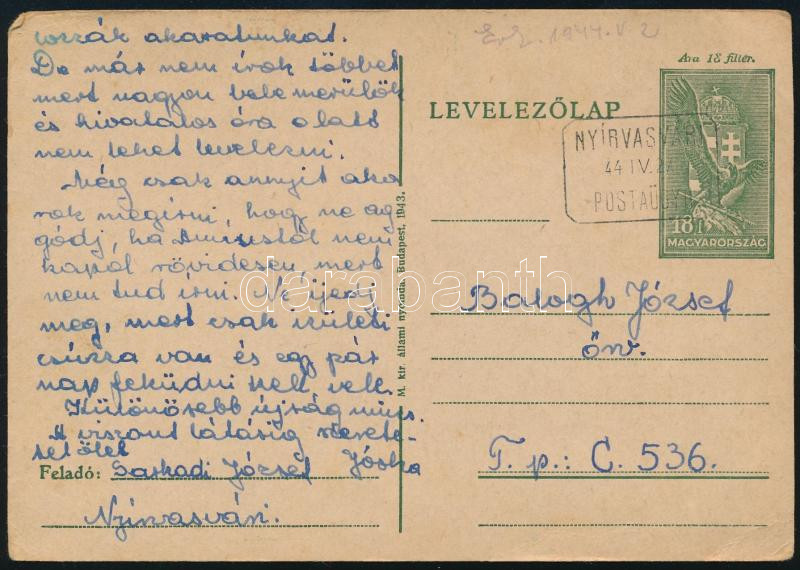 1944 Levelezőlap "NYÍRVASVÁRI" postaügynökségi bélyegzéssel