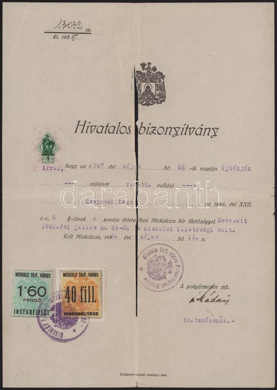 1931 Miskolc, okmány 1,6P és 40f városi ínségbélyeggel illeték