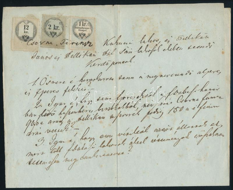 Okmány 12kr + 2kr okmánybélyeggel + 1kr hírdetménybélyeggel