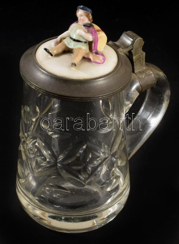 Antik söröskorsó, fedelén porcelán figura díszítéssel, fedele alján kis repedésvonallal, m: 18,5 cm