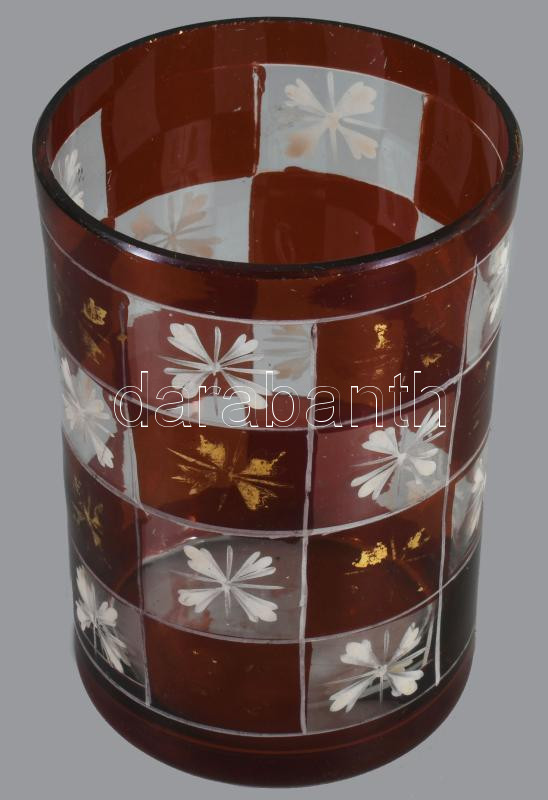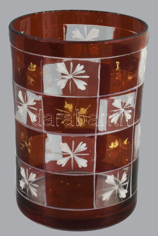 Emlékpohár bíboropácolt hutaüveg, négyzetes mintákkal, metszett, XIX. sz.
