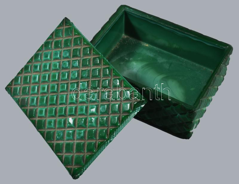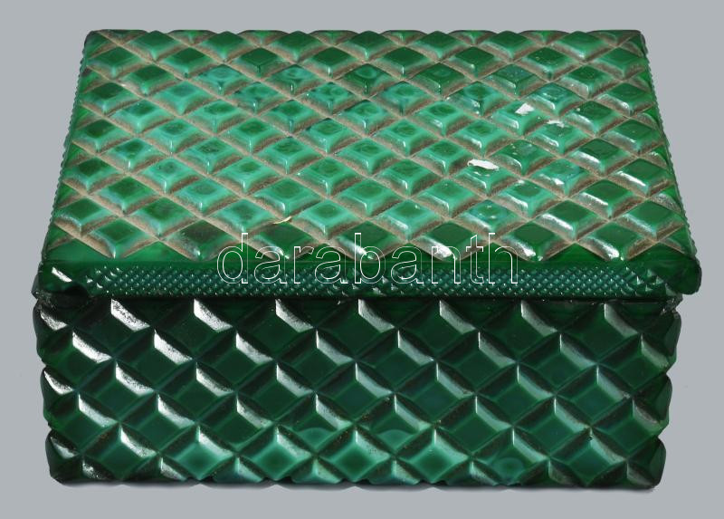 Malachit üveg dobozka, sarkán kis pattogzással 12x9 cm