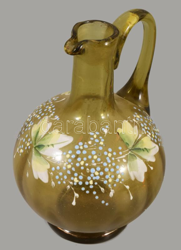 Szecessziós zománcfestett kancsó, m: 14 cm